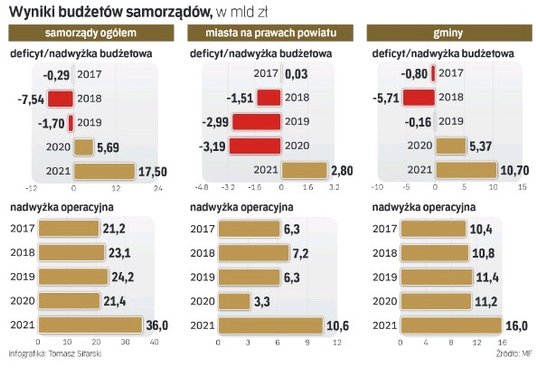 Samorządy wypracowały historycznie dobry wynik – zaznaczyło Ministerstwo Finansów, podając wstępne dane za 2021 r. Nadwyżka budżetowa wyniosła aż 17,5 mld zł, a nadwyżka operacyjna (różnica między dochodami a wydatkami bieżącymi) sięgnęła niebagatelnych 36 mld zł.