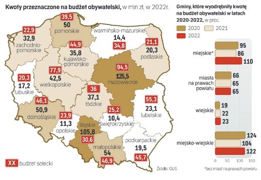 W 2022 r. budżet obywatelski posiadało niespełna 13 proc. wszystkich gmin w Polsce – podaje GUS: co trzecia gmina wiejska, co piąte miasto na prawie powiatu, 7 proc. gmin wiejskich i 38 proc. gmin miejsko-wiejskich. Gminy wyodrębniły na budżety obywatelskie kwotę 650,7 mln zł. Kwota wzrosła o 59,4 mln zł w stosunku do 2021 r. i o 29,9 mln zł do 2020 r. Najwięcej pieniędzy przeznaczono na Mazowszu i na Śląsku (ponad 100 mln zł), najmniej w woj. świętokrzyskim (10,4 mln zł) i warmińsko-mazurskim (14,4 mln zł). Na Śląsku też największy procent gmin realizował budżet obywatelski, w woj. świętokrzyskim – najmniejszy.