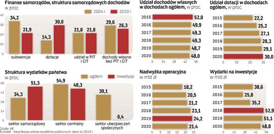 Przykładowo, jak wynika z analizy wydatków publicznych przygotowanej przez Eurostat za 2019 r., samorządy (i ich jednostki zależne) są odpowiedzialne w niemal 100 proc. za takie kwestie jak dostawy wody i odbiór ścieków, zagospodarowanie śmieci, edukacja podstawowa i ponadpodstawowa. To na ich barkach (w 70–80 proc.) spoczywa zadanie rozwoju budownictwa mieszkaniowego, kultury, sportu i rekreacji, w ponad połowie wydatków są też organizatorem transportu publicznego (np. w zakresie komunikacji miejskiej czy rozbudowy i modernizacji sieci drogowej), a w ponad 40 proc. za organizację ochrony zdrowia.