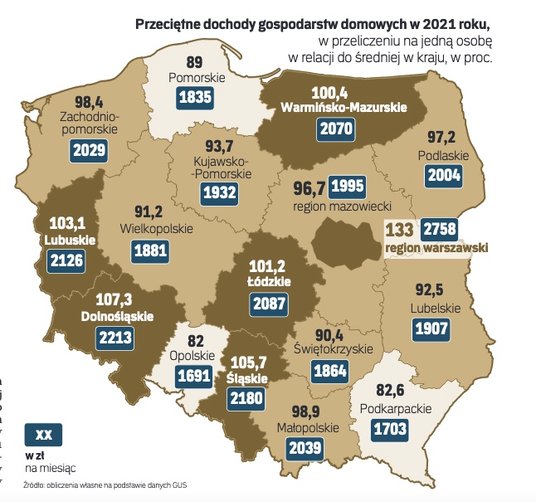 W 2021 r. najwyższym dochodem na jedną osobę w gospodarstwie domowym mogli pochwalić się mieszkańcy regionu warszawskiego stołecznego – wynika z ostatnich badań GUS. Wynosił on 2758 zł, co stanowiło aż 133 proc. średniej krajowej. Pierwsze miejsce tego regionu, jak i duży dystans do reszty kraju nie są żadnym zaskoczeniem. Za to kilka innych pozycji na regionalnej mapie zamożności Polaków budzi ogromne zdziwienie.