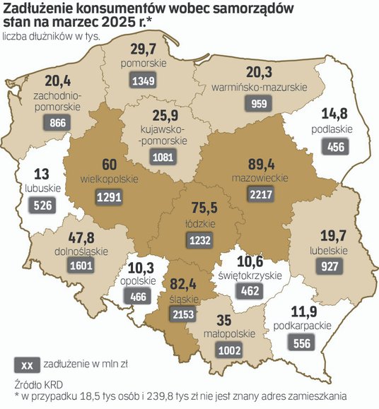 KRD podało, że na ok. 17,5 mld zł składają się zaległe: podatki, czynsze za mieszkania komunalne, wodę, wywóz śmieci, alimenty i mandaty – takich opłat nie regulują konsumenci oraz firmy wobec gmin. W ciągu dziesięciu miesięcy zobowiązania te wzrosły o 700 mln zł, a od końca 2022 r. o ponad 2,3 mld zł. Nieuregulowane zobowiązania ma łącznie 588 tys. osób i przedsiębiorstw, a średnia zaległość wynosi 29,7 tys. zł.
