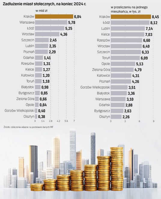 Pod względem wartości nominalnych największe zadłużenie mają oczywiście największa miasta. Zaskoczeniem może być jednak to, że pierwsze miejsce pod tym względem w 2024 r. zajął Kraków z kwotą przekraczającą 6,84 mld zł. Stolica Polski – Warszawa zajęła zaś drugie miejsce z długiem wynoszącym ponad 5,78 mld zł.