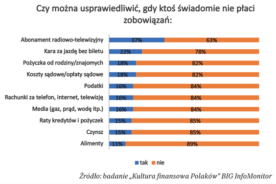 Co istotne, Polacy w zdecydowanej większości deklarowali brak akceptacji dla niepłacenia różnego rodzaju zobowiązań finansowych – w większości przypadków odpowiedzi negatywnej udzieliło ponad 80 proc. respondentów. Są jednak wyjątki. Na tym tle pojawia się stosunkowo duża skłonność do usprawiedliwiania niepłacenia abonamentu radiowo-telewizyjnego (37 proc.) czy kar za jazdę bez biletów (22 proc.). Najrzadziej usprawiedliwiano niepłacenie czynszów oraz alimentów, przy czym wskaźnik akceptujących na poziomie 15 i 11 proc. nadal uznać można za wysoki.