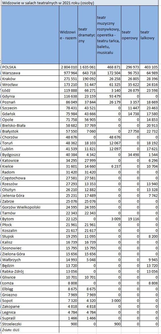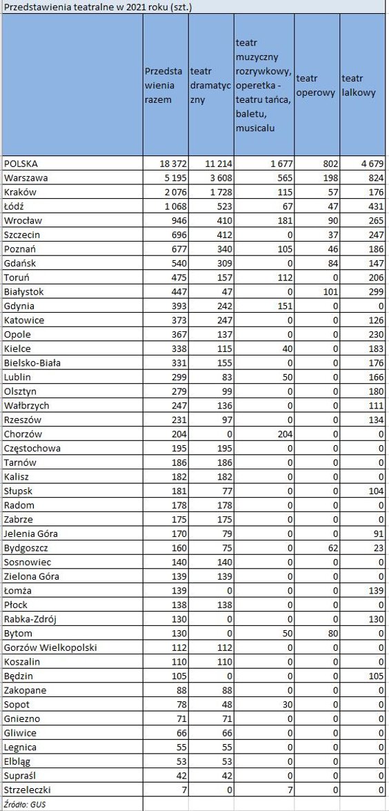 W ubiegłym roku w Polsce odbyło się 18 372 przedstawienie. To o 4,3 tys. więcej niż w 2020 i o ponad 19,6 tys. mniej niż w 2019 roku.