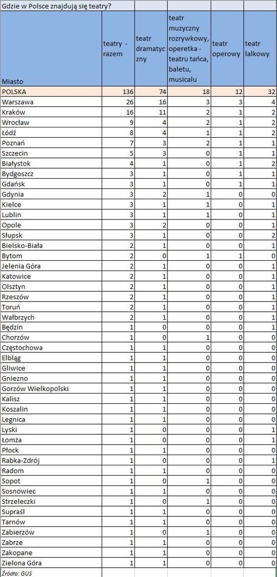 Teatry mają swoje siedzibę zazwyczaj w dużych miastach. Najwięcej 26 jest w stolicy. Najliczniejszą grupę stanowią teatry dramatyczne 16, w Warszawie są po 3 teatry muzyczne oraz operowe oraz 4 teatry lakowe. Kraków to drugie miasto z największą liczbą teatrów – 16 podium zamyka Wrocław gdzie siedzibę ma 9 różnych teatrów. W mniejszych miastach mają siedzibę przeważnie teatry dramatyczne. Chociaż w Łomży czy w Rabce-Zdrój można znajduje się teatr lakowy.