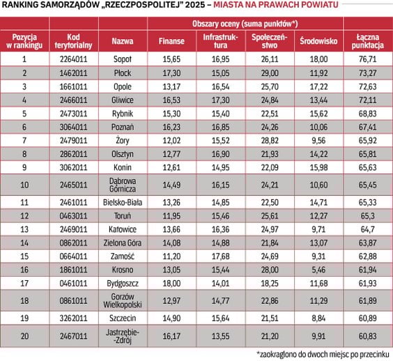 Kryteria oceny i punktacja. Źródłem danych są publicznie dostępne bazy danych (GUS, resortu finansów, resortu funduszy) oraz odpowiedzi samorządów na pytania ankietowe. Szczegółowe kryteria oceny to blisko 30 wskaźników, obejmujących lata 2022-2024, pogrupowanych w czterech kluczowych obszarach: finanse, infrastruktura, społeczeństwo, środowisko. Suma punktów uzyskanych w tych obszarach decyduje o pozycji w zestawieniu. W obszarze „finanse” oceniamy stabilność finansową i jakość zarządzania lokalnym budżetem (np. poziom dochodów własnych, zadłużenie). Obszar „infrastruktura” obejmuje inwestycje i rozwój infrastruktury komunalnej i transportowej. W obszarze „społeczeństwo” analizujemy działania na rzecz jakości życia mieszkańców i rozwoju społeczeństwa obywatelskiego, zaś obszar „środowisko” dotyczy zaangażowania samorządów w ochronę środowiska oraz transformację energetyczną.