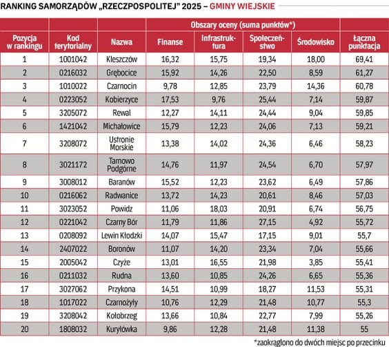 W kategorii gmin wiejskich pierwsze miejsce w Rankingu Samorządów 2025 zajęła gmina Kleszczów w woj. łódzkim, która uzyskała 69,41 pkt. Drugie miejsce należy do gminy Grębocice z woj. dolnośląskiego (61,27 pkt.), trzecie zaś – do gminy Czarnocin z woj. łódzkiego (60,78 pkt.).