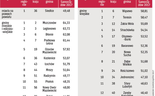Mogą one pochwalić się znakomitymi wynikami. Mszczonów w kategorii gmin miejskich i miejsko-wiejskich zajął 2. pozycję w kraju, Legionowo – 3., zaś Błonie i Podkowa Leśna odpowiednio 6. i 7. Z kolei Wąsewo uplasowało się na 6. miejscu wśród gmin wiejskich, a Teresin – na 7.