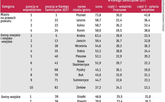 Wśród ponad 200 samorządów wyróżnionych w tegorocznej edycji Rankingu Samorządów „Rzeczpospolitej" znalazło się 16 gmin i miast z Wielkopolski. Niektóre z nich uzyskały bardzo wysoką pozycję w kraju – Poznań, stolica regionu, uplasował się na pierwszym miejscu w Polsce w kategorii miast na prawach powiatu, zaś Krobia na piątym miejscu w kategorii gmin miejskich i miejsko-wiejskich. Ale wszyscy poradzili sobie bardzo dobrze.