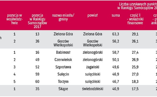 Stolice regionu – Zielona Góra i Gorzów Wielkopolski, na tle innych miast na prawach powiaty wypadły w rankingu bardzo dobrze, zajmując odpowiednio 13. i 26. pozycje. Różnice między tymi miastami nie są duże, choć oczywiście każde ma swoje mocne i słabsze strony.