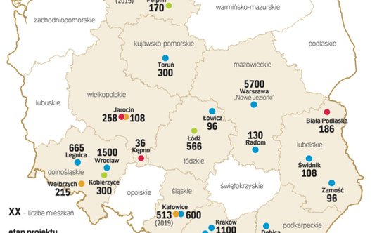 Do tej pory w ramach rządowego programu Mieszkanie Plus oddano 480 mieszkań w Białej Podlaskiej, Jarocinie oraz Kępnie (woj. wielkopolskie). Na początku przyszłego roku będą gotowe inwestycje w Gdyni, Wałbrzychu oraz Kępicach (woj. pomorskie). Projekty te nie liczą jednak więcej niż 200 mieszkań (wyjątek stanowi nieco większe przedsięwzięcie w Jarocinie), przy czym częściej są to osiedla planowane na kilkadziesiąt lokali.