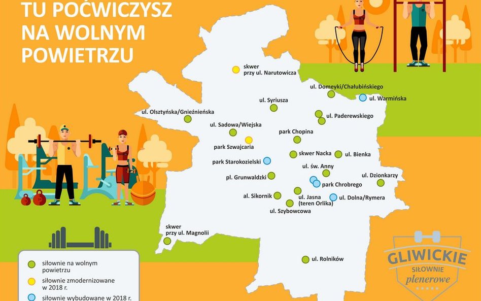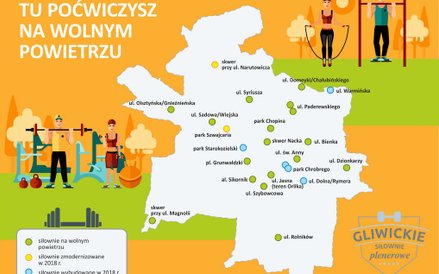Zaczęło się od kilku urządzeń siłowych na placu Grunwaldzkim, w Bojkowie oraz na skwerze przy ul. Dzionkarzy w Sośnicy. Natomiast pierwsza gliwicka siłownia plenerowa z prawdziwego zdarzenia została zainstalowana w 2013 r. u na osiedlu Obrońców Pokoju. Od tamtej pory Miejski Zarząd Usług Komunalnych w Gliwicach zrealizował już 24 tego typu inwestycje, dwanaście w ramach własnych zadań bieżących, a dwanaście kolejnych w ramach Gliwickiego Budżetu Obywatelskiego.