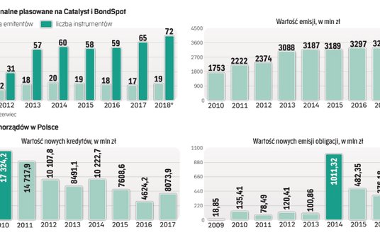 – Na przykład w raporcie firmy Grant Thornton za 2017 r. można znaleźć stwierdzenie o silnym, przekraczającym 10 proc. wzroście emisji obligacji, co w praktyce przekłada się na zwiększenie liczby notowanych serii z 59 do 65. W tym roku jest ich już 76. Reasumując, od kilku lat debiutów jest niewiele, zarówno pod względem nowych emitentów, jak i liczby instrumentów, czyli kolejnych serii obligacji. Do niedawna wydawało się, że rozpoczęcie kolejnej tury programów unijnych będzie się wiązało z wysypem emisji obligacji realizowanych przez JST, ale na razie trudno takie zjawisko dostrzec, szczególnie patrząc na Catalyst – opowiada Roman Przasnyski. Jednocześnie dodaje, że świat obligacji nie ogranicza się do platformy prowadzonej przez warszawską giełdę. Co więcej, lepiej rozwija się poza nią – tylko w tym roku JST rozpoczęły lub planują ponad 20 programów emisyjnych poza regulowanym rynkiem. – Co ciekawe, najbardziej aktywne są małe miasta i gminy. Dominują także niewielkie emisje, opiewające na kwoty od kilku do kilkunastu milionów złotych, często rozkładane na kilka do kilkunastu etapów, liczących po kilkaset tysięcy złotych każdy. Nie są to więc duże inwestycje, w większości niezwiązane z programami unijnymi, a w wielu przypadkach niezwiązane z inwestycjami w ogóle, mające raczej na celu finansowanie bieżących wydatków, łatanie deficytów budżetowych lub spłatę wcześniejszych zobowiązań. To dowodzi, że samorządy coraz chętniej sięgają po tego typu źródła finansowania, a banki, w tym lokalne (spółdzielcze), chętnie w tych programach uczestniczą i to one są głównym, jeśli nie jedynym nabywcą obligacji. Widać, że z różnych względów jest to rozwiązanie korzystne dla obu stron. Chodzi głównie o odmienne ujmowanie papierów dłużnych w bilansach zarówno JST, jak i banków – tłumaczy Przasnyski.