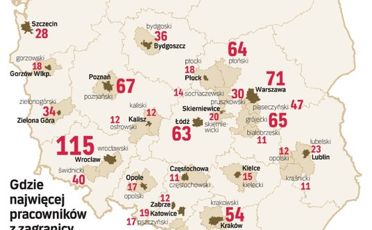 Pracodawcy z Poznania i okolic zgłosili w zeszłym roku zapotrzebowanie na prawie 68 tys. pracowników z zagranicy, co było jednym z największych poziomów w Polsce. Ale Poznań nie należy do wyjątków. Z informacji zebranych przez „Tygodnik Regionalny" wynika, że w ogóle imigranci zarobkowi najszerszym strumieniem płyną do największych polskich miast (i okolicznych miejscowości), czyli do Wrocławia, Warszawy, Krakowa, Gdańska, Łodzi czy aglomeracji śląskiej. Im mniejsze miasto, tym mniej Ukraińców, co w sumie nie dziwi, a najmniej jest ich poza miastami.