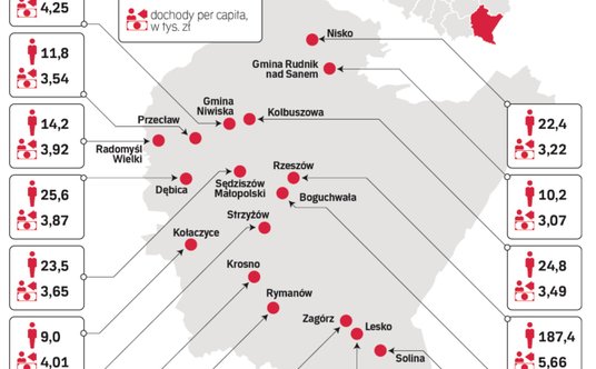 Co ciekawe, dobre wyniki podkarpackim samorządom udaje się osiągać pomimo niezbyt wysokich dochodów. Wpływy do budżetu sporej części laureatów naszego rankingu nie przekraczają 4 tys. zł na jednego mieszkańca, tymczasem średnia w Polsce to 4,58 tys zł. W województwie nie działa bowiem zbyt wiele dużych firm, która nakręcałyby lokalną gospodarkę na tyle mocno, by dynamicznie rosły i wynagrodzenia mieszkańców, i dochody samorządów. Mimo to lokalnym władzom udaje się dosyć efektywnie dzielić to, co mają, tak, by starczyło na wszystko.