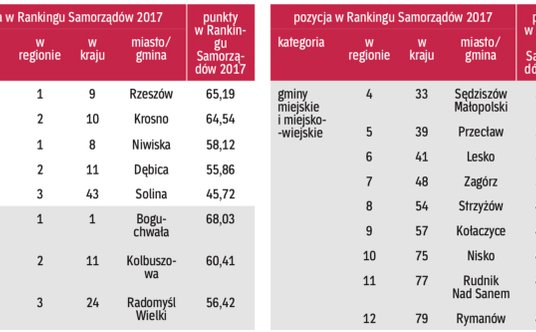 Podkarpacie samorządy zdają się bardzo dobrze wpisywać w te zasady. W tegorocznej edycji naszego rankingu znalazło się aż 17 miast i gmin z tego województwa. Wśród miast na prawach powiatu stolica regionu Rzeszów zajęła 10. miejsce, a Krosno – 11. Wśród gmina miejskich i miejsko-wiejskich Boguchwała zajęła 1. pozycję w kraju, a Kolbuszowa – 11. Z kolei wśród gmin wiejskich najlepiej wypadła gmina Niwiska z 8. miejscem w Polsce, a także Dębica – 11. miejsce.