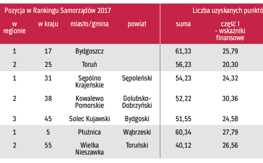 W Rankingu Samorządów 2017 znalazło się siedem gmin i miast z woj. kujawsko-pomorskiego na ponad 200 klasyfikowanych ogółem. Nie jest ich więc zbyt dużo, ale za to poradziły sobie całkiem nieźle, zajmując miejsca mniej więcej w środku stawki.