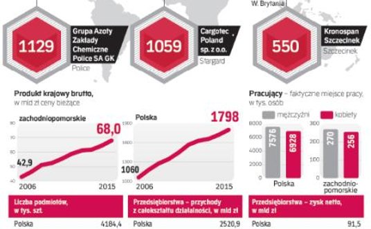 W ciągu ostatnich pięciu lat produkt krajowy brutto w województwie zachodniopomorskim wzrósł o prawie 16 proc., o 1 proc. więcej niż PKB liczone dla kraju. W 2015 roku stanowił równowartość 425 ton sztabek złota i wynosił 68 mld zł. W Zachodniopomorskiem powstaje 3,8 proc. polskiego PKB. Trzy czwarte powstaje w gospodarce, a w sferze budżetowej jedna czwarta. Wartość PKB w przeliczeniu na jednego mieszkańca w 2015 roku kształtowała się na poziomie od 32 (Lubelskie) do 74,6 tys. zł (Mazowieckie). W Zachodniopomorskiem wynosiła 39,7 tys. zł. O ponad 7 tys. zł mniej niż wskaźnik liczony dla Polski. Region otaczają trzy województwa i we wszystkich wskaźnik ten jest niższy: w lubuskim wynosi – 39 tys. zł, w pomorskim – 44,9 tys. zł, a w wielkopolskim – 50,9 tys. zł.