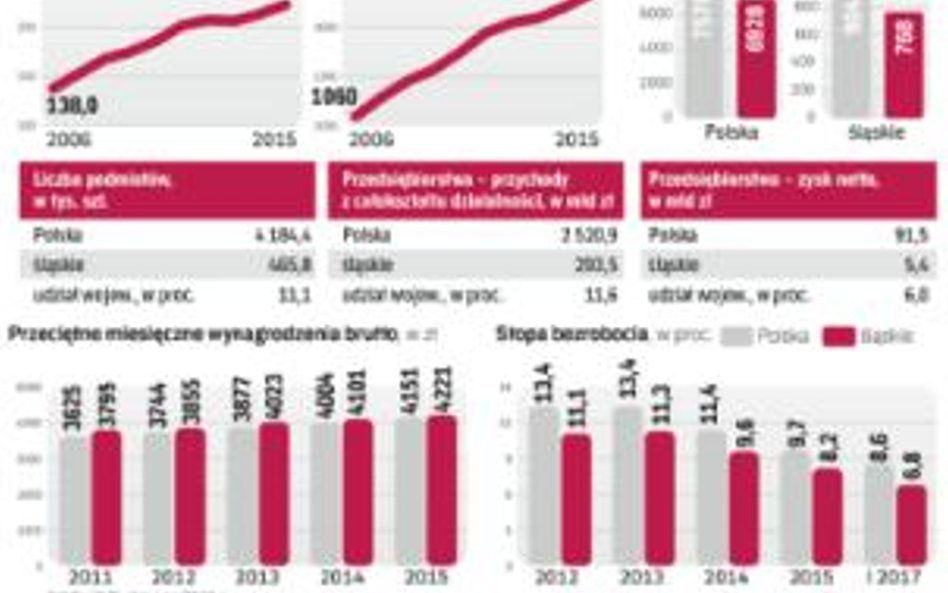 Jest to najbardziej uprzemysłowiony region Polski o tradycyjnych specjalizacjach, takich jak górnictwo, hutnictwo, przemysł maszynowy, a w ostatnich latach także motoryzacja i cały sektor automotive. Na Śląsku wytwarzanych jest aż 12,4 proc. PKB. Stopa bezrobocia w I kwartale 2017 roku wynosiła 6,8 proc. Dla porównania: średnio w Polsce było to 8,6 proc.
