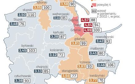 W mniejszych miastach i gminach już tak dobrze nie jest. Jak wynika z powiatowej mapy wynagrodzeń przygotowanej na podstawie danych GUS, we wszystkich pozostałych powiatach płace są niższe od średniej, a w powiecie kościerskim to tylko 75,1 proc. przeciętniej płacy w Polsce (3,1 tys. zł). Także w porównaniu do Gdańska to duża różnica, bo zarobki w stolicy regionu są aż o ok. 60 proc. wyższe.