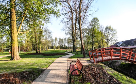 Na początek zaglądamy do odnowionego parku w Ochli, który założony został w I połowie XIX wieku. Dzisiaj jest łatwo dostępnym miejscem spacerowym. Najważniejszym zadaniem w ramach rewitalizacji tego terenu było odnowienie stawu na skraju parku, do którego prowadzą alejki. Uroku miejscu dodają mostki nad parkowymi strumykami.