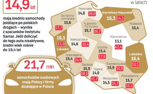 Co gorsza, spora cześć z nich jest już dosyć zaawansowana wiekowo, a średni wiek aut w Polsce to 14,9 roku; dla porównania – w Niemczech to ok. dziewięciu lat. Jeśli chodzi o porównanie między polskimi regionami, różnice, co trochę zaskakujące, nie są duże.