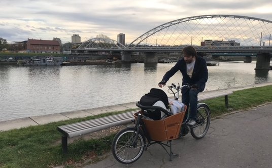 Jesteśmy rodziną 2+1, rodzice 40+ i 3-latek. Nieraz słyszeliśmy „Z dzieckiem, bez samochodu? Nie dacie rady!”. Mówimy: potrzymaj nam dzwonek. Młody na pierwszą krótką przejażdżkę pojechał w wieku 3 miesięcy, w specjalnie przystosowanym rowerze cargo. Jeździliśmy dwa lata do żłobka, co tydzień na basen, regularnie na wycieczki. Wszędzie tam, gdzie zwykle jeździ się z dzieckiem samochodem. Jeździmy rowerem też bez dziecka: do opery na holendrach w wieczorowym stroju, na większe zakupy – cargo. Na wakacje do pociągu zabieramy gravela i przełajówkę oraz przyczepkę rowerową dla dziecka. Nie ma złej pogody na rower, więc jeździmy cały rok. Zdarzają się dwa–trzy dni, kiedy nie da się pojechać, przez np. nieodśnieżone drogi – spychacza do roweru jeszcze nie mamy.