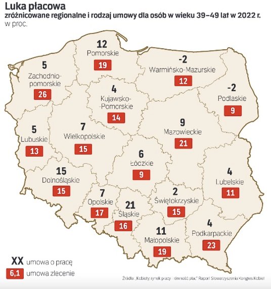 Największa grupa pracowników to osoby w wieku 35–59 lat. Na nich sprawdzano, jakie są regionalne różnice dotyczące luki płacowej. Największa jest na Śląsku: w przypadku umów o pracę jest to 21 proc. Powyżej średniej luka płacowa występuje także na: Dolnym Śląsku (15 proc.), Pomorzu (12 proc.) i w Małopolsce (11 proc.). Najmniejsze różnice są w województwach: warmińsko-mazurskim, podlaskim oraz świętokrzyskim. Co ciekawe, w dwóch pierwszych luka nie istnieje – jest ujemna, a to oznacza, że płace kobiet są przeciętnie wyższe o 2 proc.