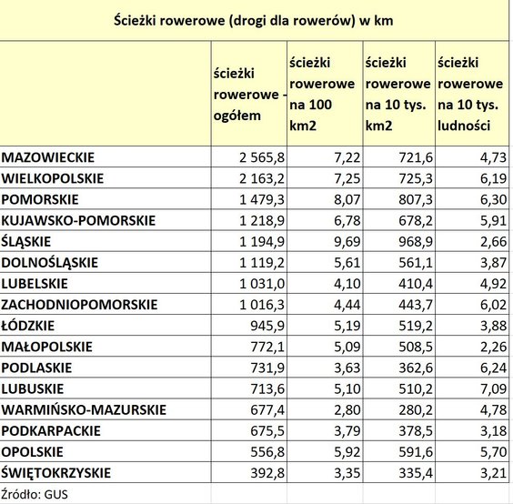 W województwie śląskim na 100 km kwadratowych przypada niemal 10 km drogi rowerowej, a w warmińsko-mazurski tylko 2,8 km.