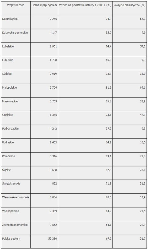 Polska Akademia Nauk obliczyła wskaźnik pokrycia planistycznego dla każdej z 2477 gmin. Od 2003 roku w Polsce obowiązuje Ustawa o planowaniu i zagospodarowaniu przestrzennym, która jest podstawą dla decyzji inwestycyjnych w samorządach lokalnych.