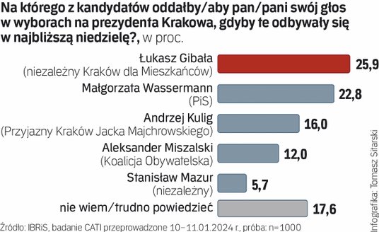 W Krakowie po raz pierwszy od 2002 roku mieszkańcy miasta nie będą mogli głosować na Jacka Majchrowskiego. IBRiS sprawdził w badaniu dla „Rz”, kto miałby największe szanse go zastąpić. Najwięcej wskazań – 25,9 proc. – ma niezależny polityk Łukasz Gibała. Po piętach depcze mu posłanka PiS Małgorzata Wassermann, która ma 22,8 proc poparcia. To oznacza, że ta dwójka mogłaby spotkać się w II turze wyborów, która przewidziana jest na 21 kwietnia.