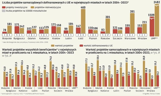 Wartość przedsięwzięć inwestycyjnych była ok. 41 razy wyższa per capita niż pozostałych i wyniosła 18,4 tys. zł. Projekty samorządowe to 6 proc. z 9602 projektów wszystkich stołecznych beneficjentów, a ich wartość to 38 proc. z 48,7 mld zł.