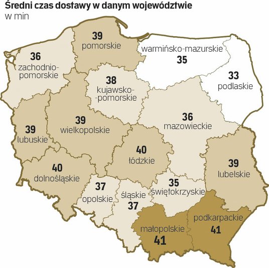 Palmę pierwszeństwa, jeżeli chodzi o szybkość dostaw, dzierży Białystok. W przypadku tego miasta średni czas doręczenia posiłku wyniósł 35 minut i 6 sekund, podczas gdy dla województwa podlaskiego to średnio 33 minuty. Wynik lepszy niż gdzie indziej – w woj. zachodniopomorskim to średnio 36 minut, a świętokrzyskim i warmińsko-mazurskim po 35 minut. Z kolei średnio najdłuższy czas dostawy widać w przypadku dolnośląskiego i łódzkiego, gdzie wynosi 40 minut. W podkarpackim to nawet 41 minut i to województwo ma średnio najdłuższy czas realizowania dostaw. Na Mazowszu to 36 minut, w Wielkopolsce – 39, a w Łódzkiem – 39.